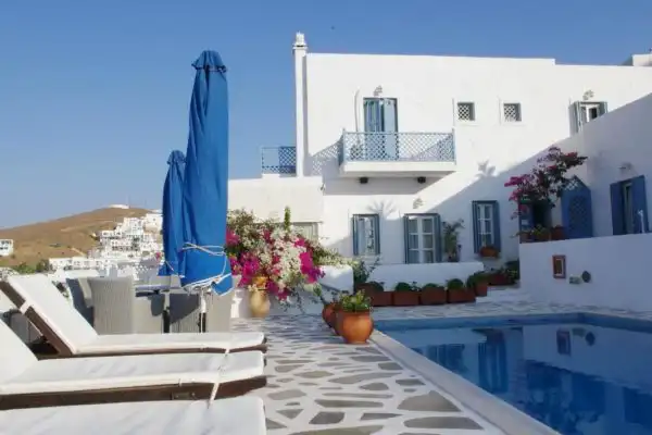 Dette fine kykladelignende lejlighedshotel ligger i Chora blot 200 m fra den flotte gamle fæstning. Herlig udsigt til havet fra lejlighederne og poolen. Der er cirka 600 m ned til havnen og 700 m ned til stranden, og ellers er der caféer, spisesteder og butikker tæt på i de små gader i Chora.