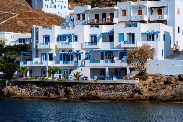 Dette lejlighedshotel ligger med første parket til vandet ved havnen i Chora, og har en fantastisk udsigt til bugten, byen og den flotte fæstning. Der er rummelige lejligheder med balkon og en stor fælles sol-/spiseterrasse. Herfra kan man følge livet i havnen og man er tæt på det hele.