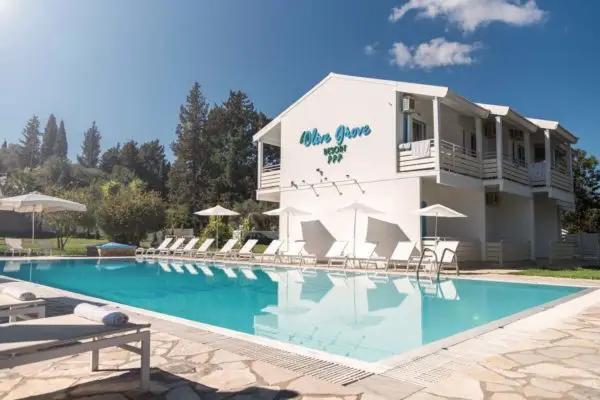 Olive Grove Resort er et fint mindre hotel der ligger 100 m fra kysten og med 500 m til den gode lange strand. Værelserne er pæne og enkle, og der er restaurant og pool-bar på stedet. Resortet ligger i udkanten af Kavos i nogenlunde rolige omgivelser blandt oliventræer. Caféer, barer, spisesteder og indkøbsmuligheder er indenfor gåafstand.