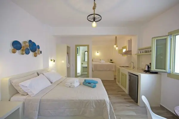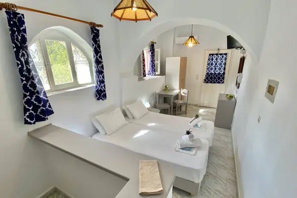 Disse bungalows ligger i udkanten af Chora i meget fredelige og smukke omgivelser, og appellerer til dem der sætter pris på æstetik, autencitet og ro. Huset er i traditionel kykladisk stil og har fine terrasser og balkoner, hvor den flotte udsigt til havet, naturen og byen kan nydes. Morgenmad af lokale råvarer. Chora med caféer, spisesteder og butikker er indenfor gåafstand. Stedet et godt udgangspunkt for vandreture i området.