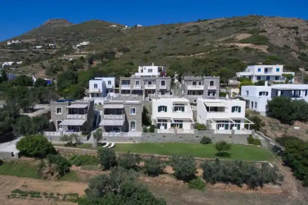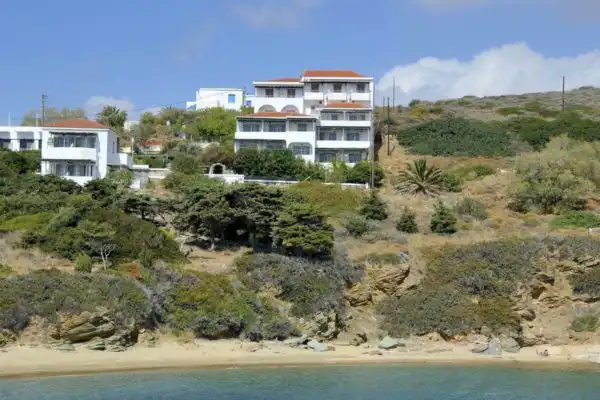 Dette lejlighedskompleks ligger mellem to af Andros’ bedste strande, og der er flere andre strande inden for gåafstand. De små huse har balkon med fantastisk udsigt, og det hele fremstår lækkert og afslappende. Der er 2,5 km til havnebyen Gavrio, hvor der er caféer, spisesteder og indkøbsmuligheder.