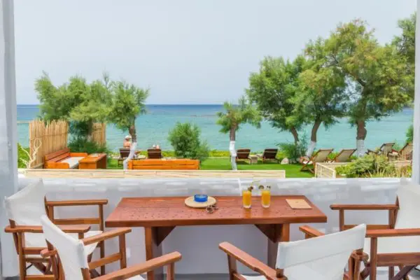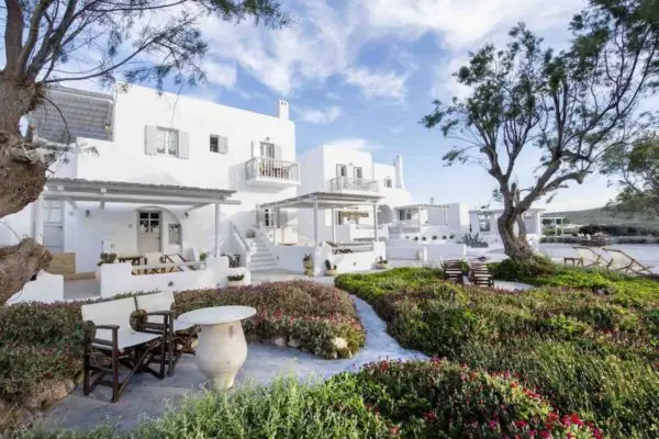 Hotel Del Mar ligger blot 40 m fra stranden i Pollonia. Her er ni værelser der alle er indrettet smagfuldt og i traditionel stil. Det hele er niveauer over, hvad man normalt oplever på de græske øer. Super lækkert.