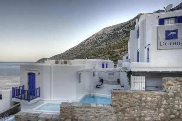 Delphini er skønt beliggende i Kamares-bugten modsat havnen. Delphini tilbyder smagfuldt indrettede værelser med egen balkon – de fleste med havudsigt. Nogle af værelserne har egen udendørs pool eller spabad. Hotellet ligger 5 minutters gang fra fra stranden.