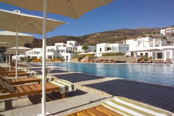 Elies Resorts i Vathi er Sifnos’ bedste – og dyreste – hotel. Vi snakker rendyrket luksus og god smag over hele linjen. Elies ligget godt placeret direkte til stranden i Vathi omgivet af oliventræer. Her er restaurant, swimmingpool, cocktail-barer, spa-område, tennisbane m.m.