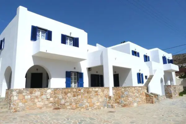 Lejlighedskomplekset ligger i Chora cirka 4 km fra havnebyen. Her er du midt i den rolige gamle hovedby med de små hyggelige gader. Gode lejligheder med balkon, nogle med flot udsigt til havet. Tæt på spisesteder og bageri.