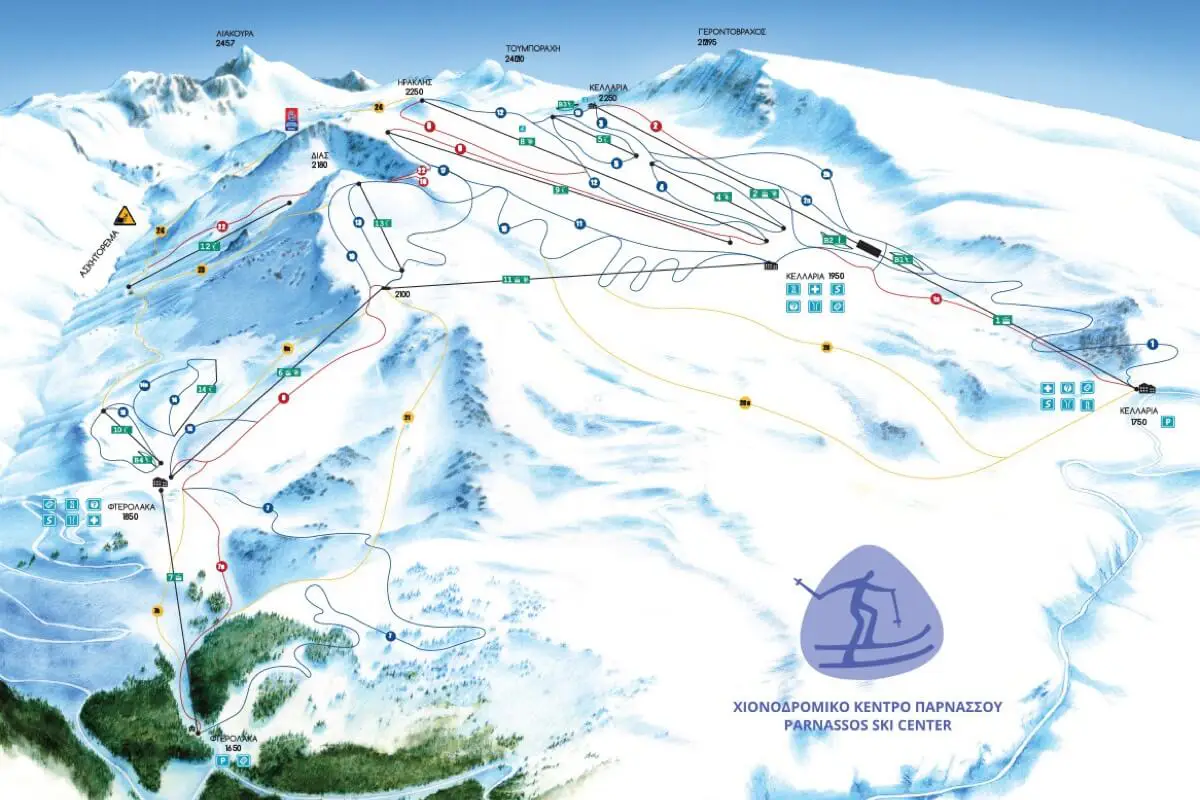 Parnassos Skicenter ligger i det centrale Grækenland og er Grækenlands største skisportssted og det der ligger tættest på Athen. Pisterne fordeler sig på de to toppe: Kellaria på 1.750 m og Fterolakas på 1.950 m. Tilsammen er her 21 pister fordelt over 36 km. Den korteste er på 300 m og den længste på 4 km. Anlægget er fuldt moderniseret i 2014-2015.